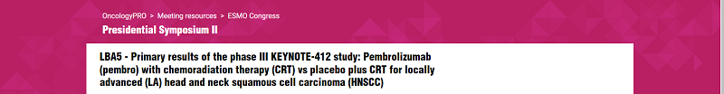 Badanie III fazy porównujące standardową chemioradioterapię radykalną zaawansowanych płaskonabłonkowych nowotworów głowy i szyi (krtań, gardło dolne, jama ustna oraz gardło środkowe) vs skojarzenie z jednoczasową i podtrzymującą terapią pembrolizumabem (pembro + CRT vs placebo + CRT). Wykazano korzystny trend EFS w stronę grupy z pembrolizumabem, jednak nie uzyskano istotności statystycznej. Nie odnotowano nowych, wcześniej nieobserwowanych działań niepożądanych.