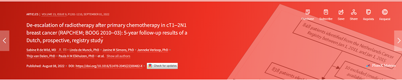 Duńskie prospektywne badanie kohortowe, w którym w zależności od odpowiedzi na neoadjuwantową chemioterapię w raku piersi (cT1-2N1) badacze kwalifikowali pacjentów do grupy niskiego (ypN0), pośredniego (ypN1) oraz wysokiego ryzyka (ypN2-N3) wznowy. U pacjentek, które miały pCR w węzłach chłonnych i przeszły mastektomię rezygnowano z radioterapii uzupełniającej, co było związane z 2,1% ryzykiem 5-letniej wznowy miejscowej. Badacze postulują potencjalną deeskalację radioterapii u wybranych pacjentek w tej grupie.