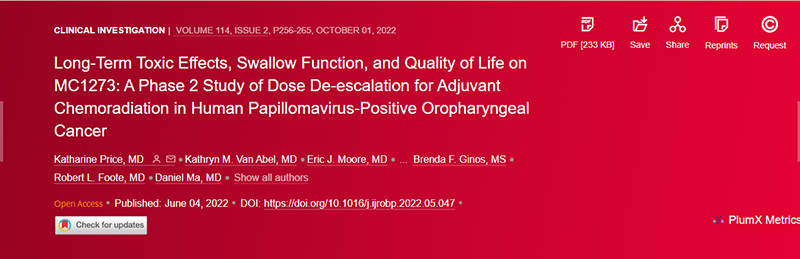 Badanie opisujące efekty deeskalacji radioterapii podczas radiochemioterapii u pacjentów z pośrednim ryzykiem w porównaniu do pacjentów z naciekaniem pozawęzłowym w leczeniu pooperacyjnym (transoral robotic surgery) w grupie 72 pacjentów z rozpoznaniem p-16 pozytywnego raka gardła środkowego oraz do 10 paczkolat w wywiadzie choroby. W toku 24 miesięcznej obserwacji zaobserwowano niski odsetek toksyczności m.in. pod względem przełykania oraz ogólnej z zależnej od suchości w jamie ustnej jakości życia.