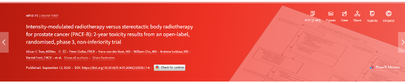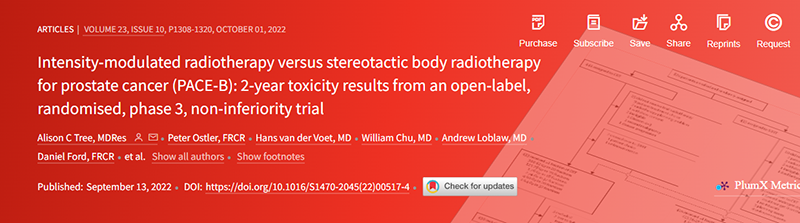 Prospektywne badanie kliniczne 3-fazy porównujące radioterapię konwencjonalną (początkowo 78Gy w 39 frakcjach, od 2016roku 62Gy/20fr) vs. SBRT (36,25Gy/5fr) u pacjentów z rakiem prostaty niskiego i średniego ryzyka. Pierwszorzędowym punktem końcowym była toksyczność (>=G2 )w zakresie p. pokarmowego oraz układu moczowo-płciowego, oceniana po 2-latach od RT. Badacze nie zauważyli istotnych różnic w toksyczności, a stopień G4 i wyższy nie wystąpił u nikogo spośród 874 badanych pacjentów. Autorzy postulują bezpieczeństwo SBRT w tej grupie chorych. Dane oceniające skuteczność oraz dane biochemiczne są jeszcze niedostępne.