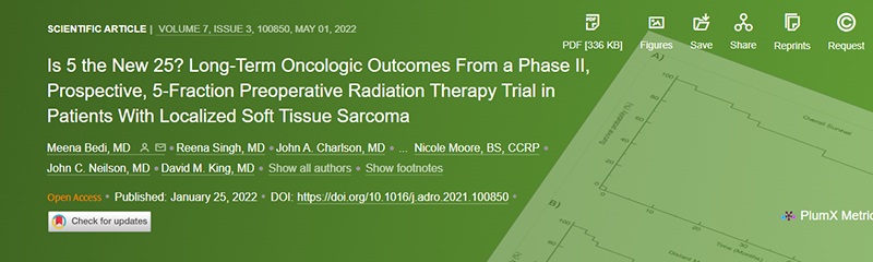 Długoterminowe wyniki badania klinicznego dotyczącego zastosowania pięciofrakcyjnej przedoperacyjnej radioterapii z lub bez chemioterapii w leczeniu chorych na mięsaki tkanek miękkich, do dawki całkowitej 35 Gy. Do badania włączono 34 chorych. Mediana obserwacji wyniosła ponad 3 lata. U żadnego chorego nie zaobserwowano wznowy miejscowej. Późne powikłania napromieniania w postaci włóknienia w stopniu 2 i 3 wystąpiły odpowiednio u 21,7% i 13% napromienionych osób. Autorzy uważają, że zastosowanie hypofrakcjonowanej przedoperacyjnej radioterapii w tej grupie chorych jest związane z wysoką kontrolą miejscową i przeżyciem, z akceptowalnym profilem toksyczności.